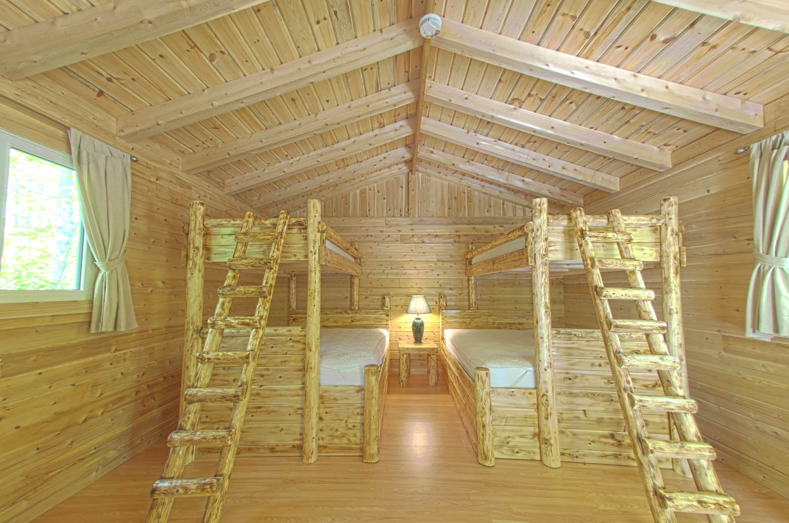 This log camping cabin, located in our hardwood forest, is wheel-chair accessible and sleeps up to 6 people. Like our other camping cabins units, this basic cabin offers a small fridge, outdoor cooking grill, fire pit and picnic table. Centralized washrooms next door and laundromat close by.