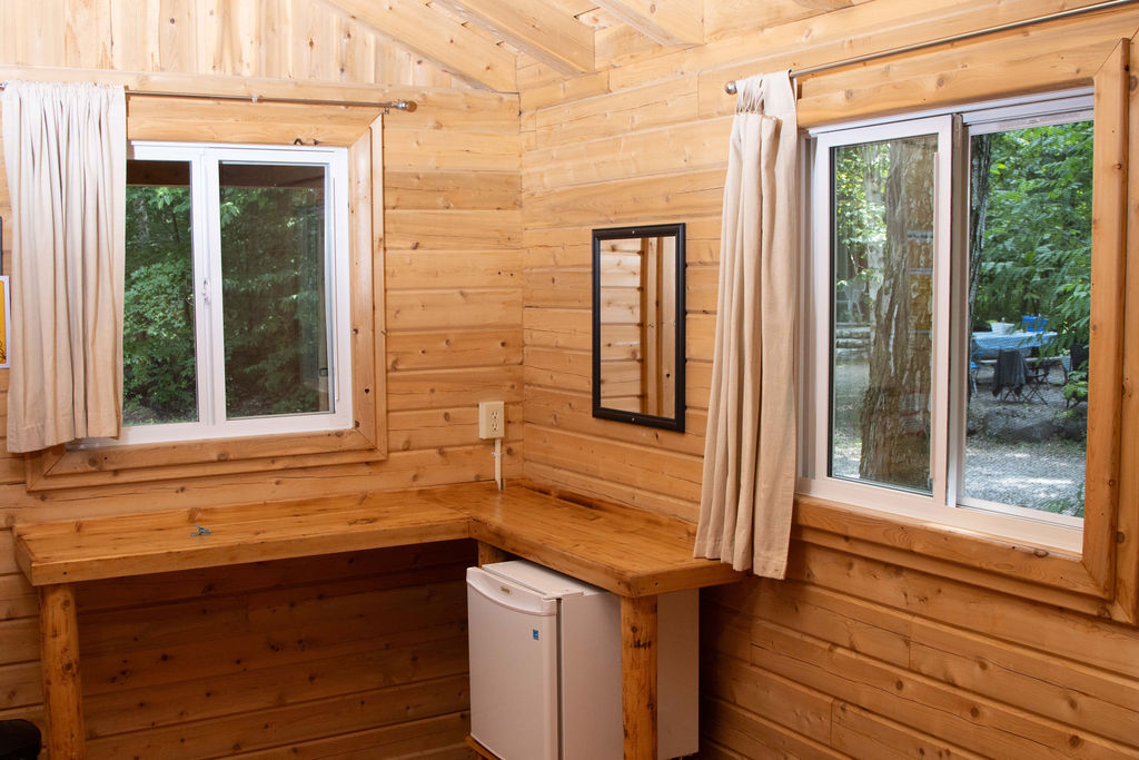 This log camping cabin is located in Summer House Park's hardwood maple forest. Perfect for those who wish to camp with some 'creature-comforts' and a roof over their heads! This basic cabin offers a small fridge, outdoor cooking grill, fire pit, and picnic table. Centralized washrooms next door and laundromat close by.